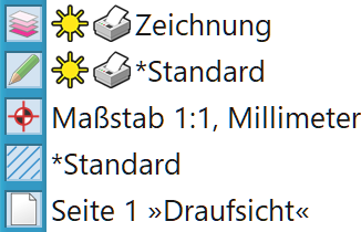Am unteren Ende der linken Skala werden, falls nicht ausgeschaltet, einige Taster zur direkten Auswahl der Elemente (Ebenen, Stifte, Koordinatensysteme, Schraffuren und Seiten) angezeigt. Ein Klick mit der linken Maustaste auf diese Taster ruft das entsprechende Auswahlmenü auf. Die gleichen Elemente werden eventuell an anderer Stelle des Zeichenfenster ein weiteres Mal dargestellt, nämlich neben den entsprechenden Tastern der Leiste.