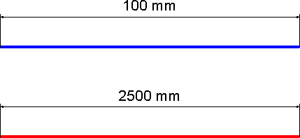 Multiple ScalesEach drawing can have several coordinate systems defined within it. The following figure shows two lines of a drawing. Although the dimension of the lines are different, when printing each lines have got a length of 100 mm. The lower line was drawn in another scale (Scale 1:25, mm) as the other one (Scale 1:1, mm). All dimensions are related to the current scale.