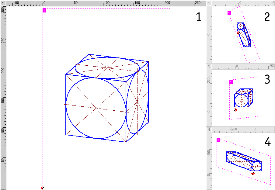 After you have generated all three new coordinate systems, choose coordinate system 1, "Drawing & Dimension" and leave the dialog. In order to apply the newly generated coordinate systems to the small windows, click on the upper left corner of the relevant window. The window number is displayed there in [square brackets]. The ruler display shows which window is active. After activating one of the small windows, you can apply a coordinate system to it by choosing Manage > Coordinate Systems / Scales > Edit and setting the coordinate system to the desired one in the dialog. Activate the dimetric views for windows 2-4.