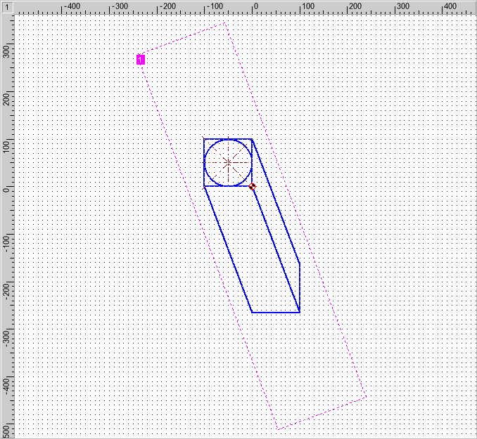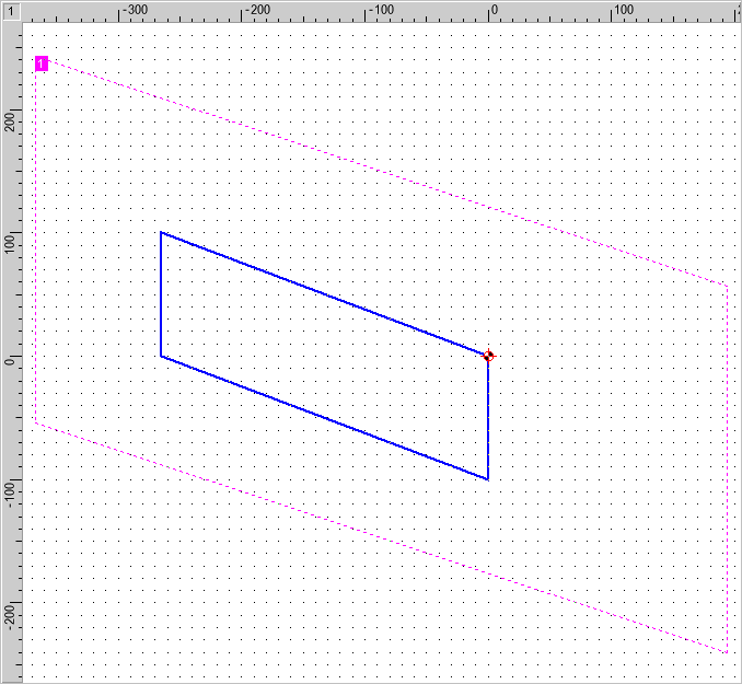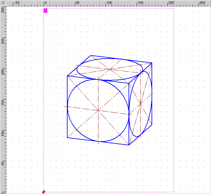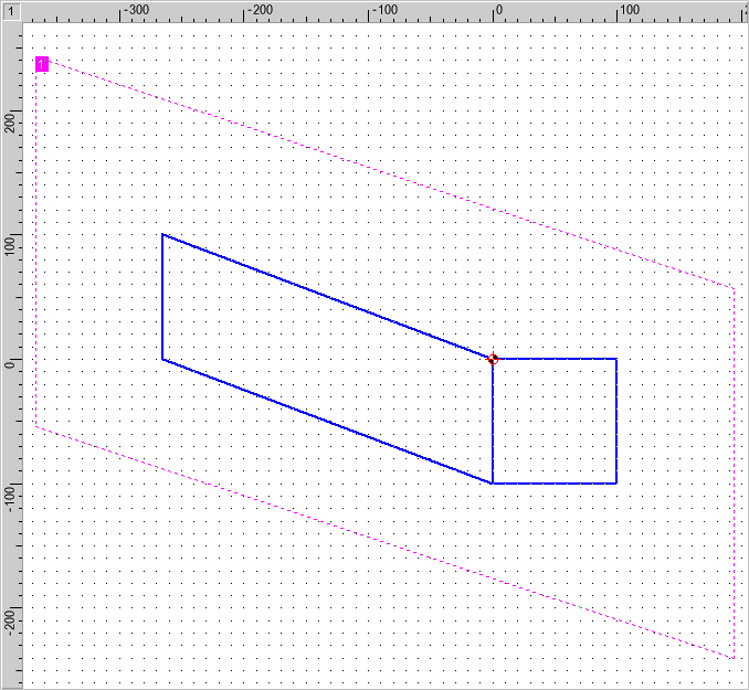 Begin by drawing a square with sides 100 mm (that is, 10 grid points) long, using the pen "0.5 mm\Solid Line Wide". Use Draw > Polygon > Parallelogram. to do this. To have the same origin for the grid in the other views, set the zero point to the upper right corner of the square. Do this with Manage > Coordinate Systems / Scales > Set Origin. Place a marking on this point using Construct > Marking > Single (Figure 3).