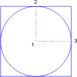 You can use the plan view in the main window for the next step. Choose Draw > Ellipse > Vector - Vector. Click at the midpoint of the last-drawn square to specify the center of the ellipse (1). Set the other two points by clicking on the midpoint of the upper horizontal line (2) and the right hand vertical line (3) respectively. In the plan view, a circle will now have been drawn (Figure 7).